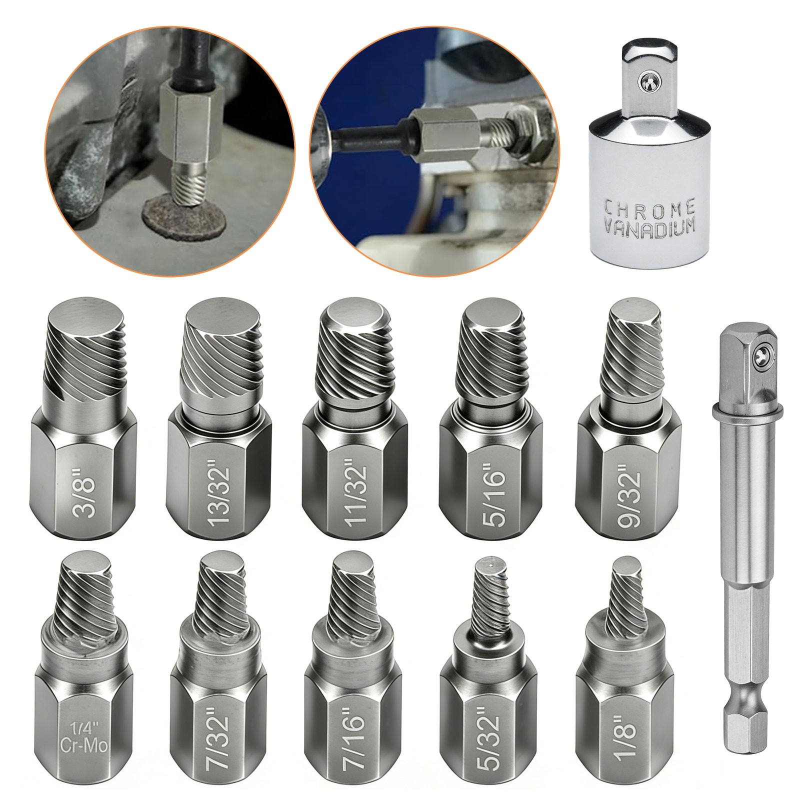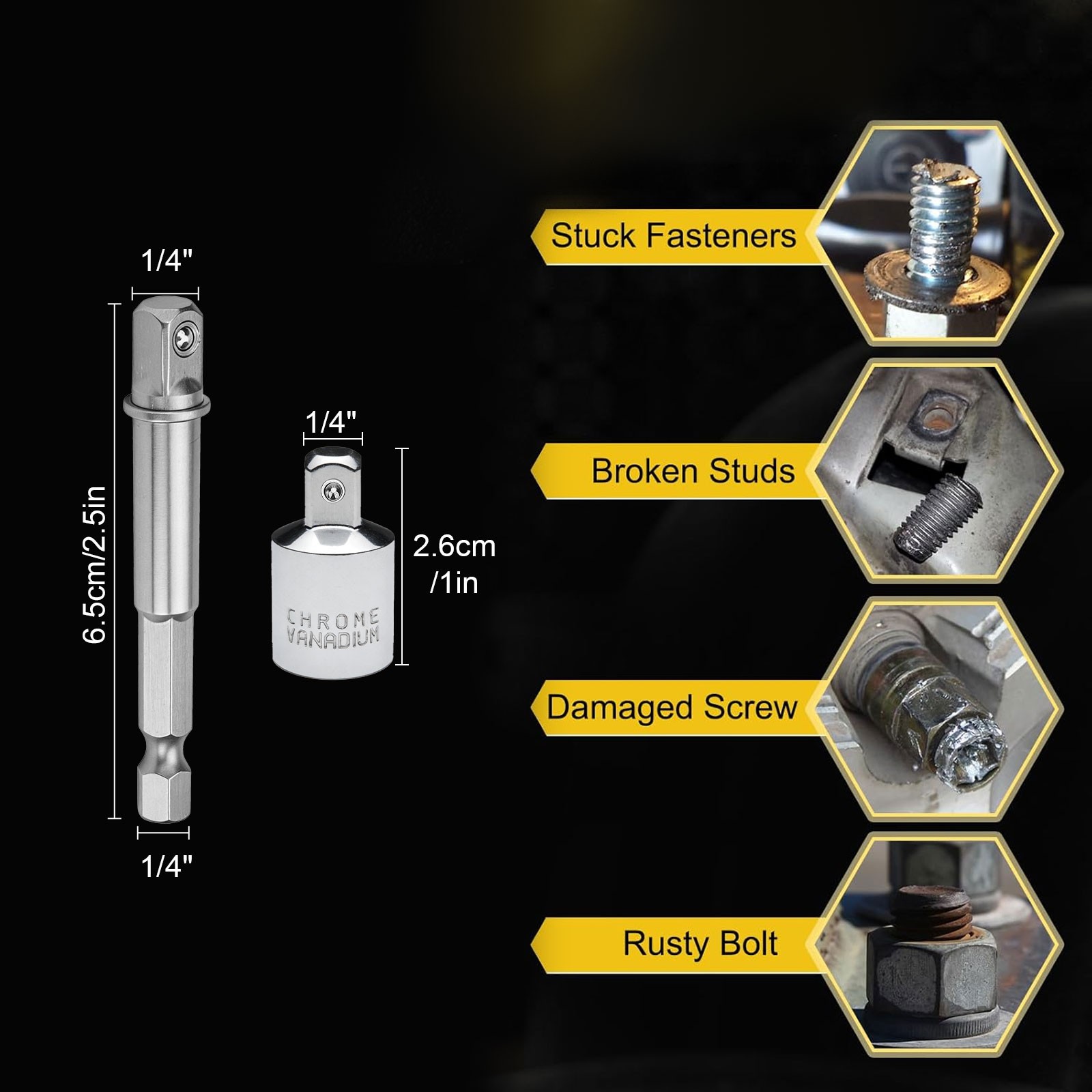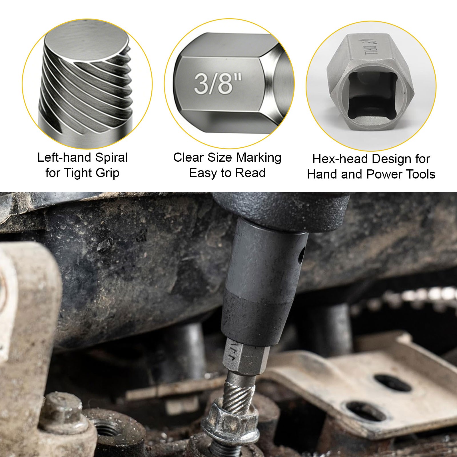 Remove broken bolts, Extract stripped screws, Remove rusted / seized fasteners, Extract rounded, sheared, damaged bolts