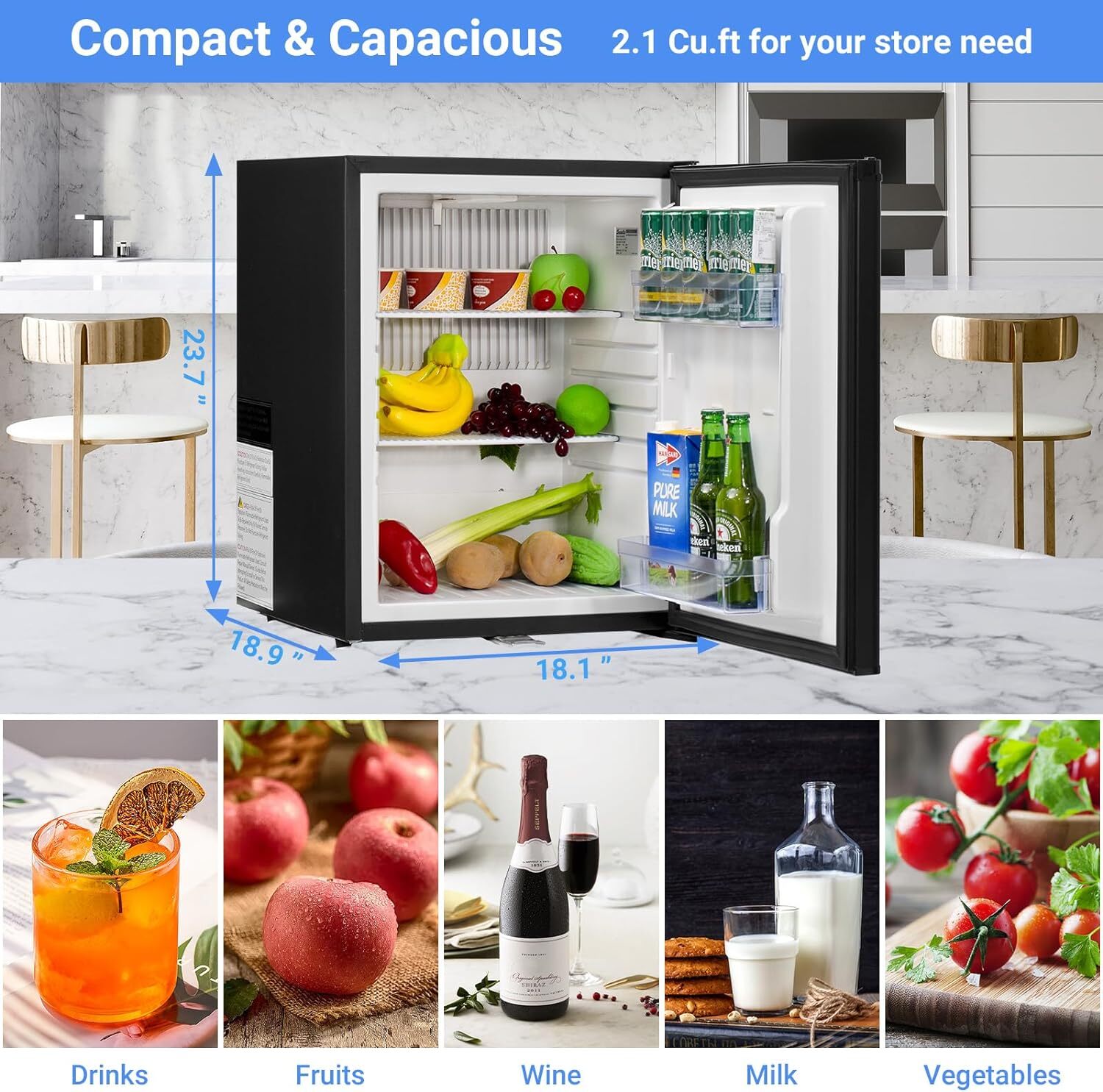 Absorption Cooling, Adjustable Thermostat, Frost Free, Quiet, Reversible Door