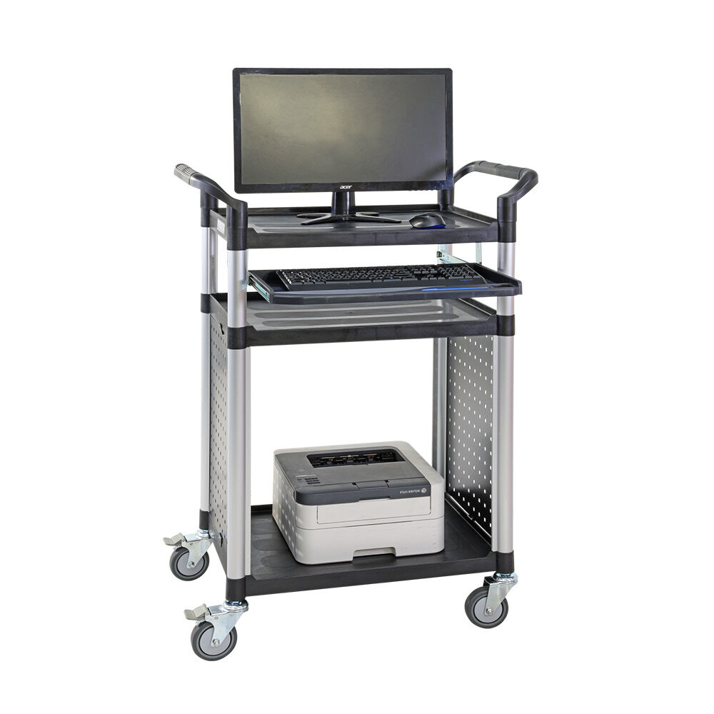 - The 3 Tier Aluminium Framed Computer Cart with a slide-out shelf offers a convenient and versatile solution for both office and warehouse environments
