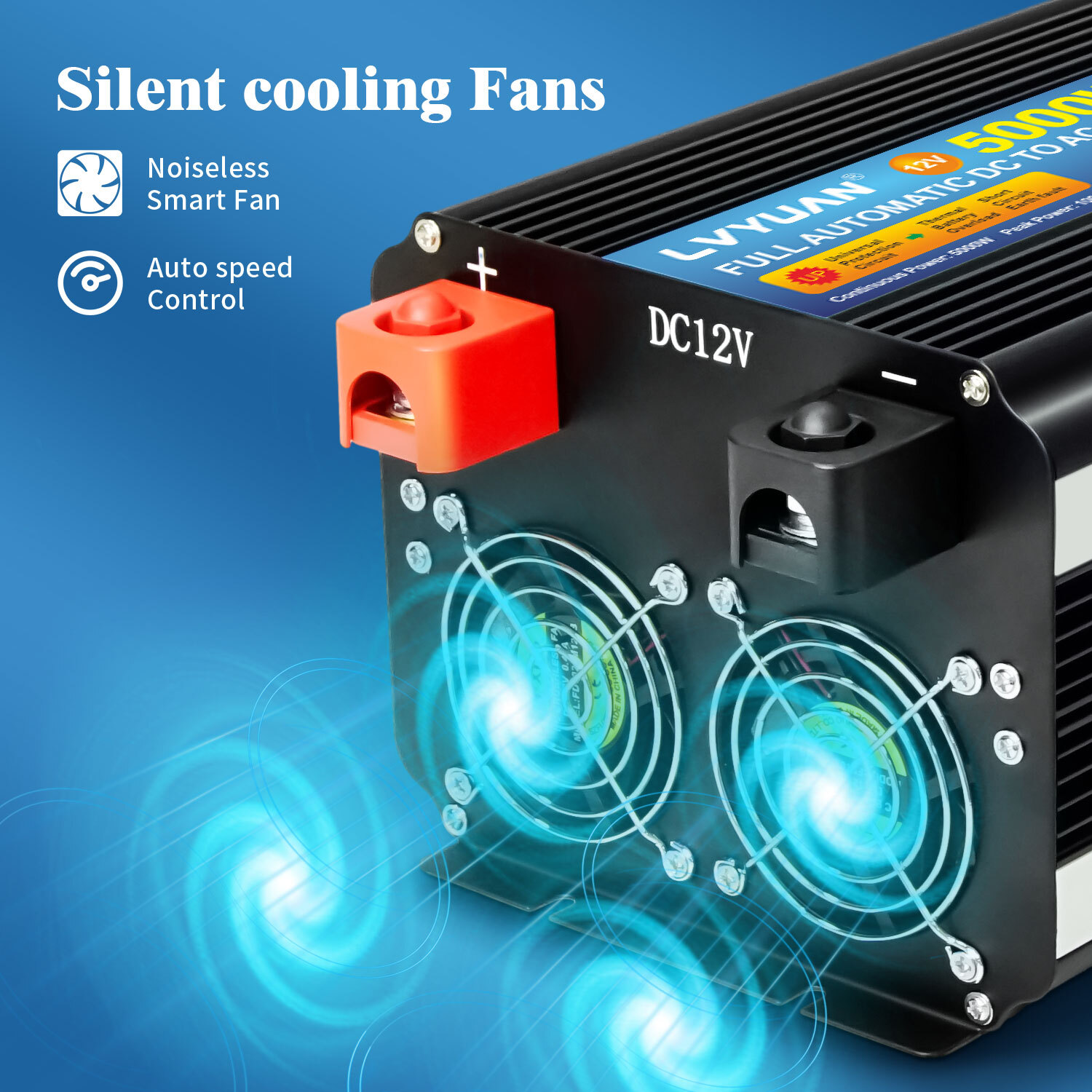 DC/AC, High Voltage Input Protection, Low Voltage Input Protection, On/Off Switch, Over Battery Voltage Protection, Overheating Protection, Short Circuit Protection