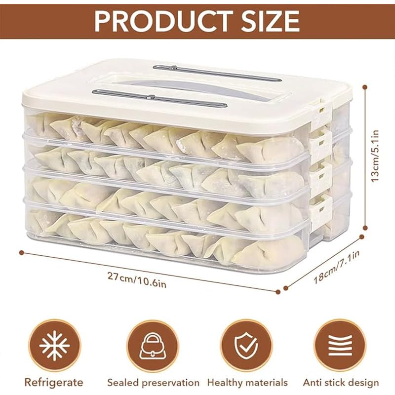 - 🥟 Multi-layer Stackable Design – The versatile design allows for multiple layers of dumplings to be stored in a single box, saving you freezer space and keeping everything neatly organized.