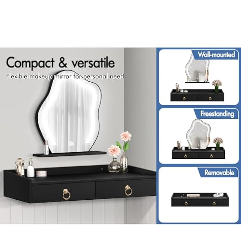 ALFORDSON Wall-Mounted Dressing Table Set with Adjustable LED Mirror, Drawers and Storage Stool, Floating Makeup Dessk 77cm, Black