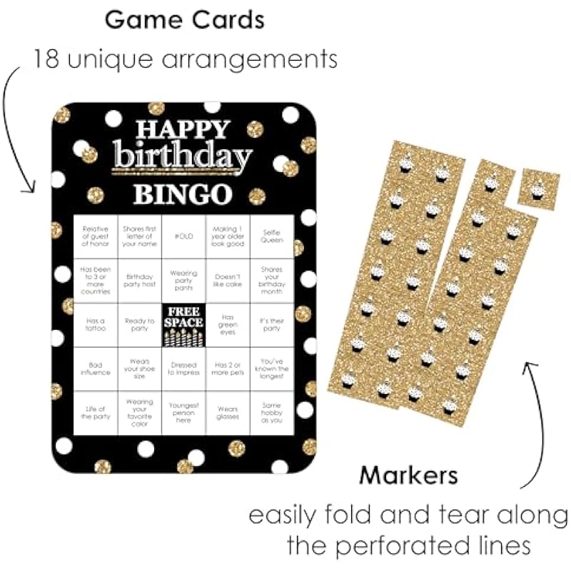 - MUST-HAVE PARTY SUPPLY: Bingo is an easy and classic Adult Happy Birthday – Gold game that everyone will have fun playing. Find The Guest Bingo Cards and Markers give this classic game a fresh look with Adult Happy Birthday – Gold playing cards and activities related words instead of numbers.