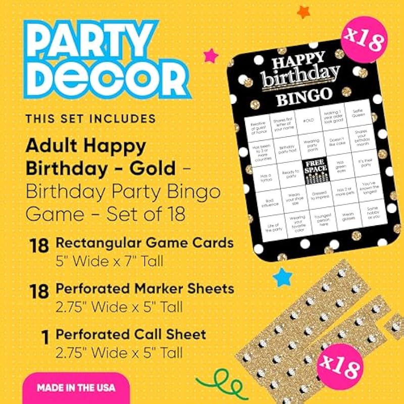 - MADE IN THE USA: Adult Happy Birthday – Gold Bingo Game is designed and manufactured at our Wisconsin facility using materials that are Made in the USA. Adult Happy Birthday – Gold Bingo Game Cards uses a No-Mess Glitter Print: Our party games are designed with a printed image of glitter, eliminating glitter flake while maximizing bling effect!