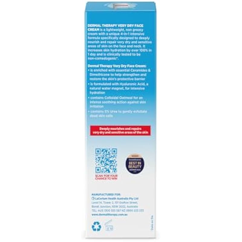 Dermal Therapy Very Dry Face Cream, Intensive Nourishing Cream for Very Dry & Sensitive Face & Neck Skin, Hydrates, Repairs & Protects with Ceramides & Hyaluronic Acid, Non-Greasy, Lightweight | 50g
