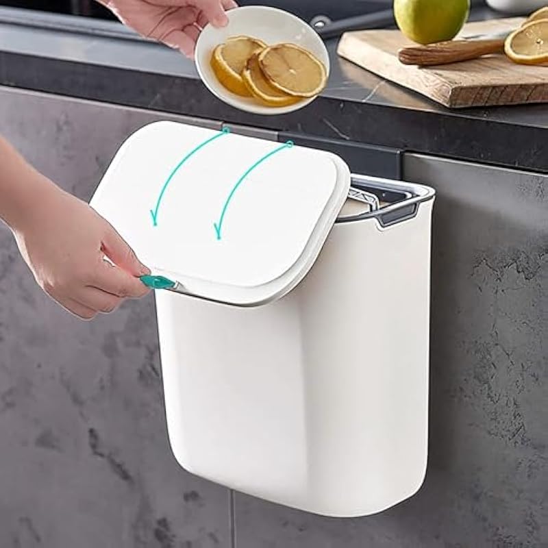 Hanging Trash Can with Lid for Kitchen Cabinet Door, 9 L Wall Mounted Garbage Can Kitchen Compost Bin for Countertop or Under Sink