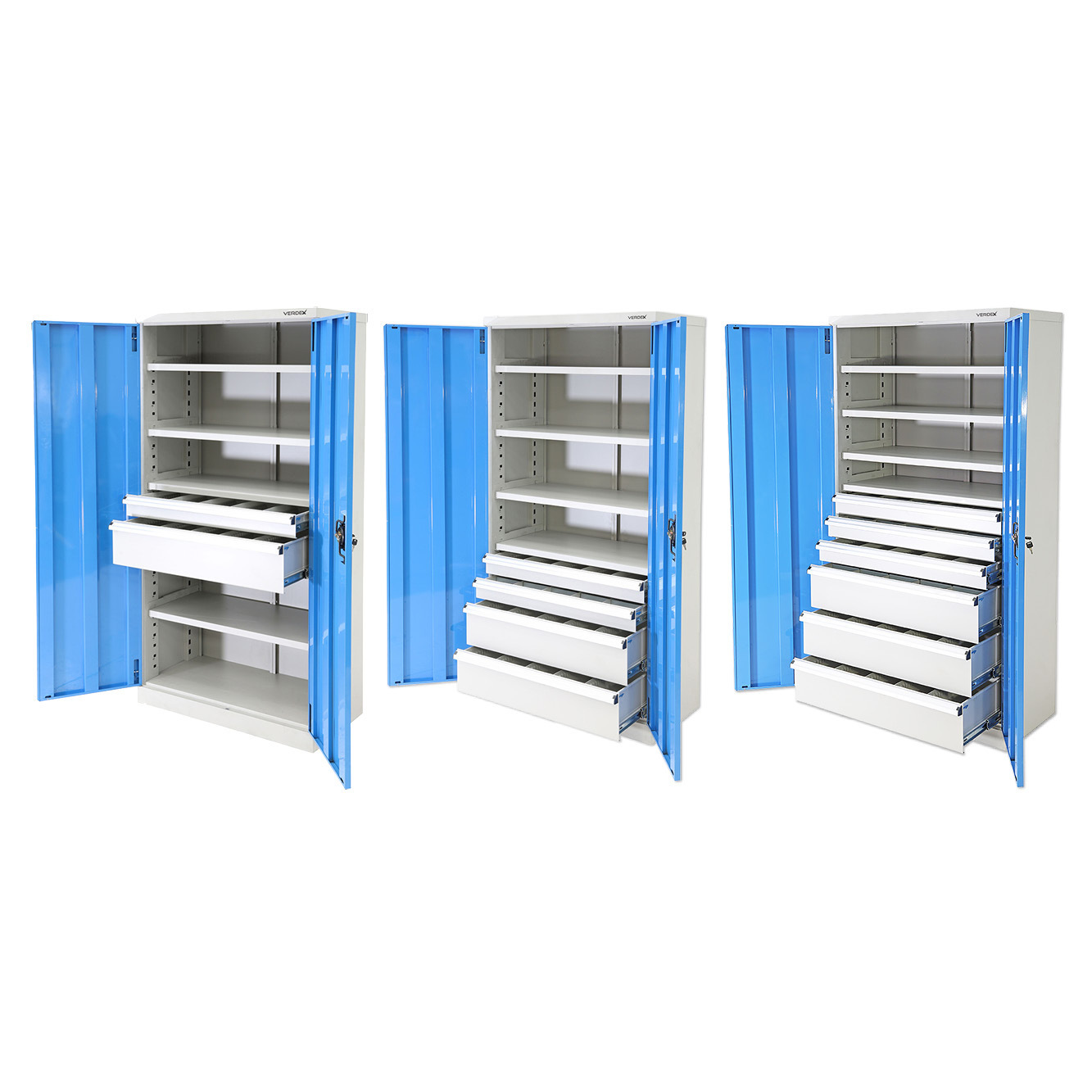 - Finish: Powdercoated light grey with light blue coloured doors