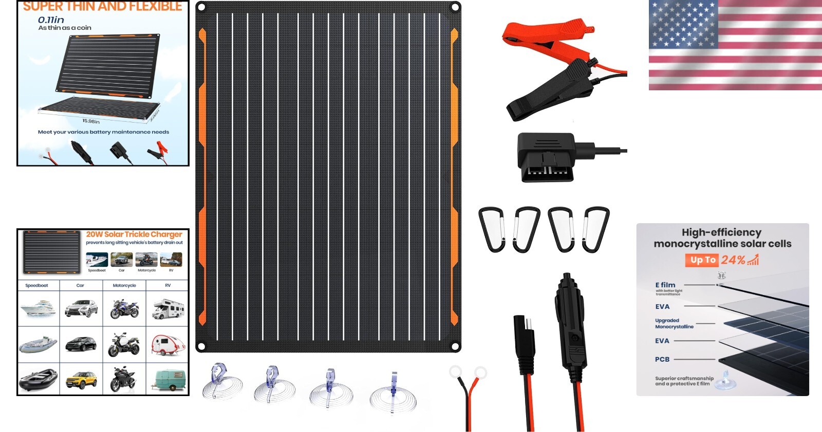 Maintenance Free, Portability, High Efficiency, Intelligent Charge Controller, Water Resistant, Lightweight Design, Adaptive Charging, Versatile Connectivity