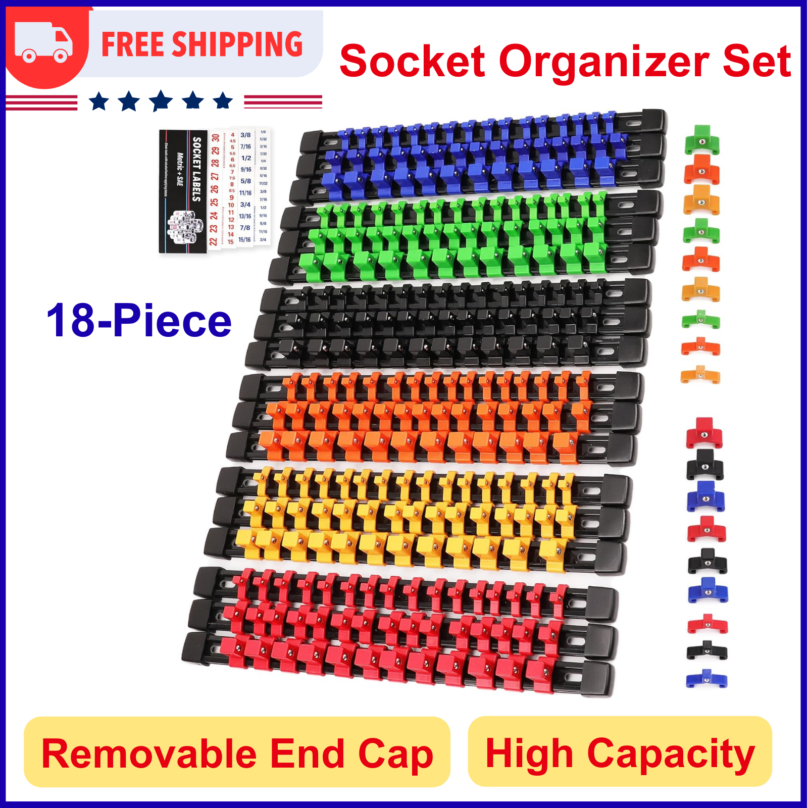 Heavy-Duty Molded ABS Plastic, Fits Shallow & Deep Sockets, Removable End Caps, Spring-Loaded Ball Bearing Clips