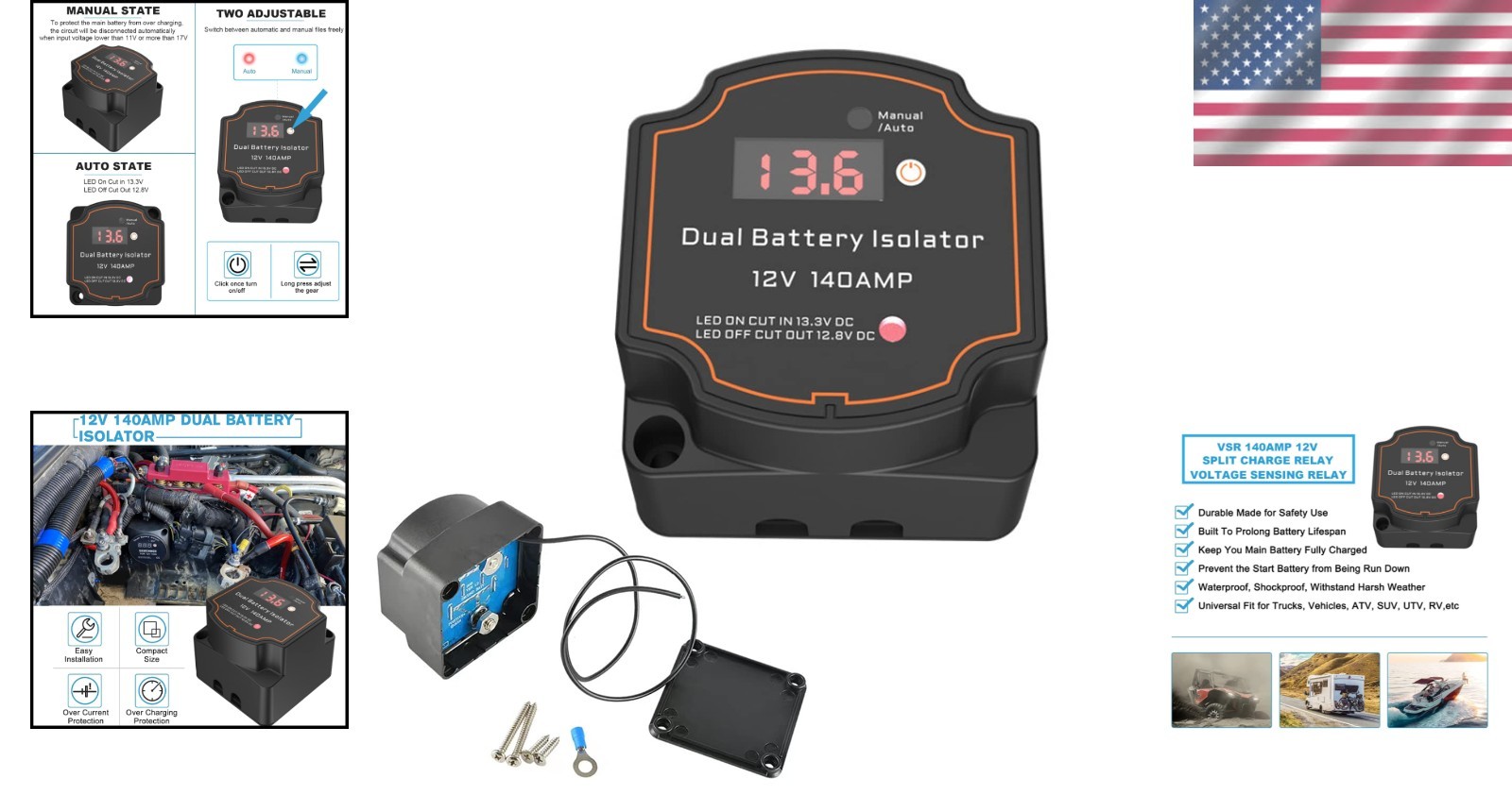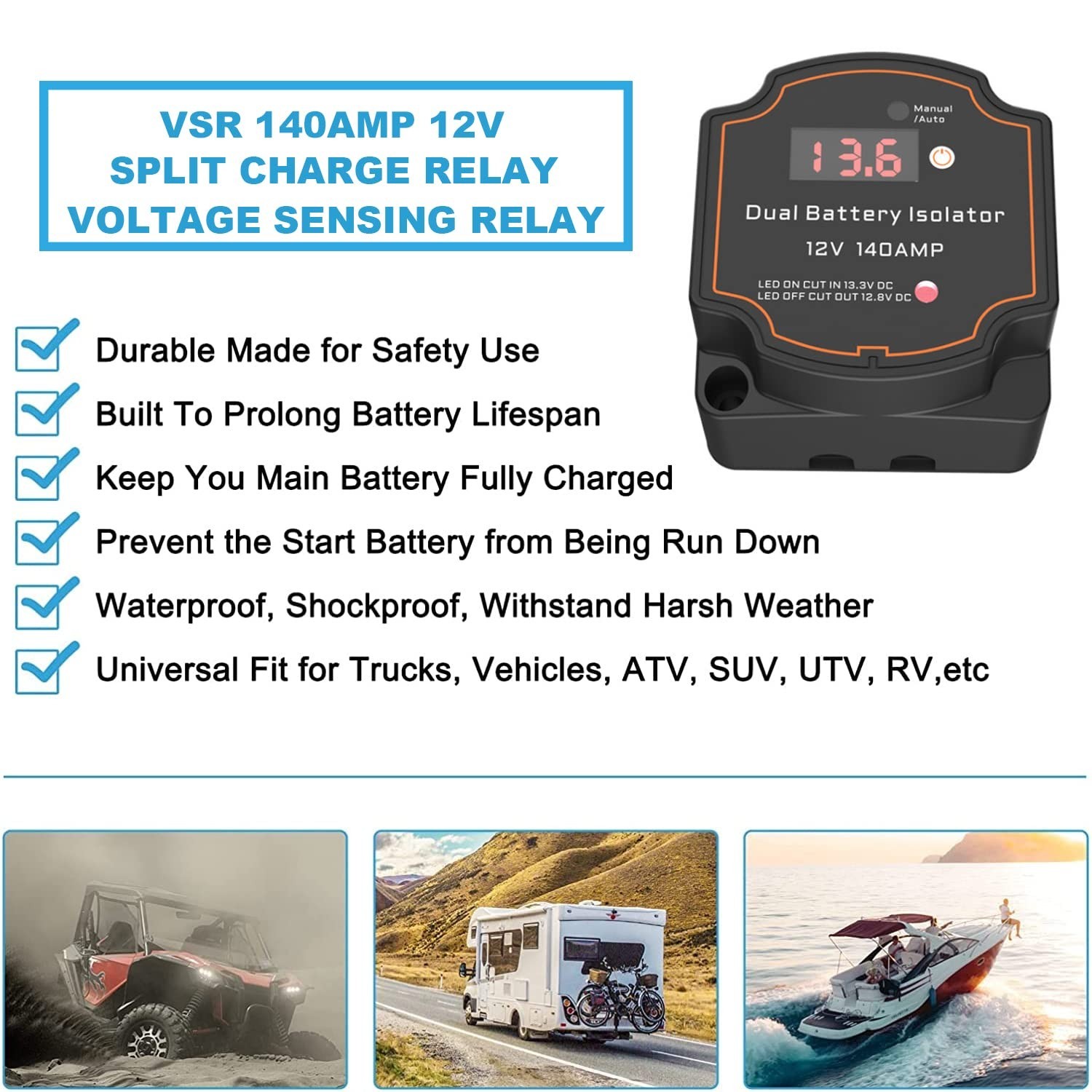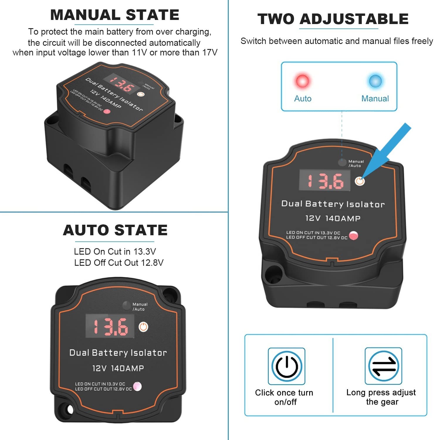 Split Charge Relay 12V 140A Dual Battery Isolator Auto/Manual Modes LED Displ…