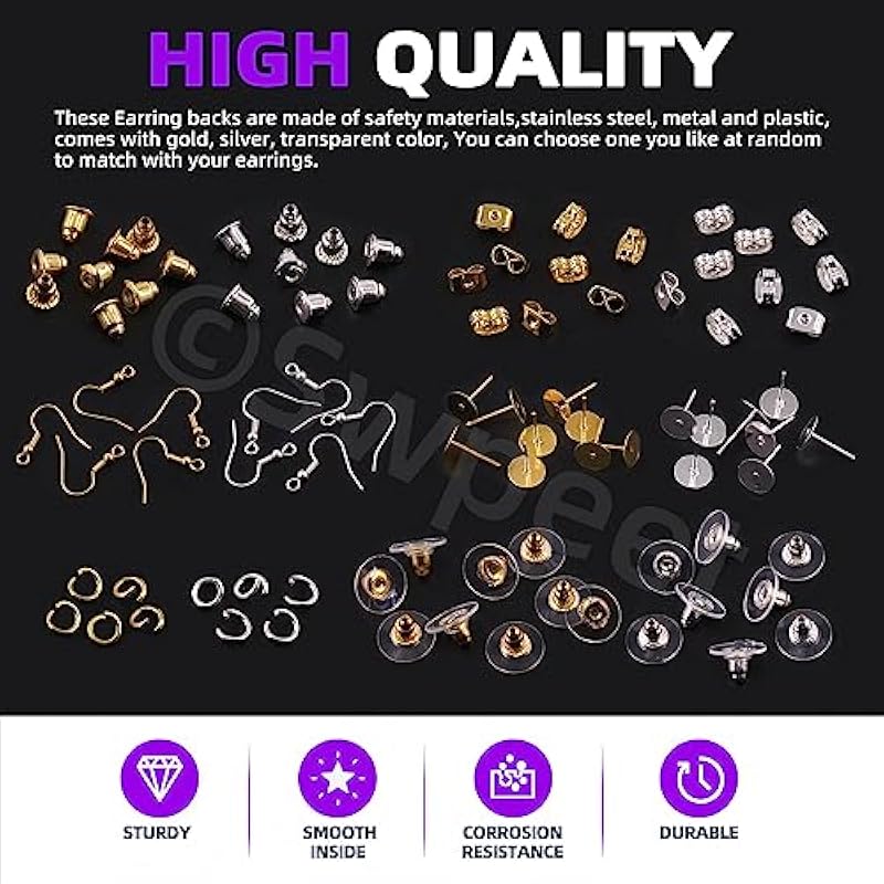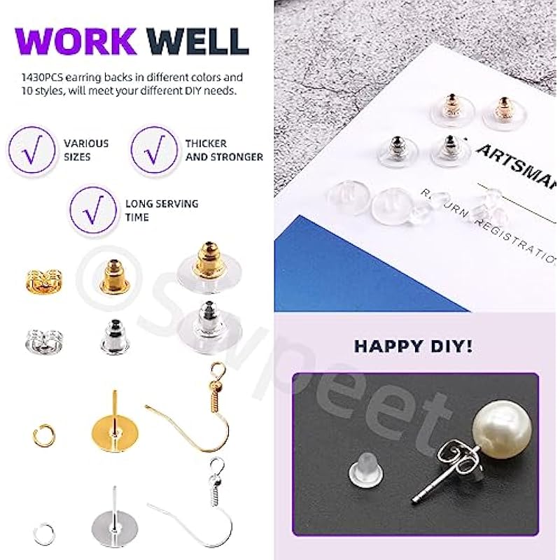 - 💎【Pakage Includes】In this kit, You will get 1430Pcs 10 Styles Hypoallergenic Earring Backs and Earring Hooks with Open Jump Rings Assortment Kit, including 1170 pieces (585 pieces) of different earring backs, 80Pcs earring hooks, 80Pcs earring posts, and 100Pcs open jump rings, with a sufficient quantity and style to choose from, without fear of loss or damage.