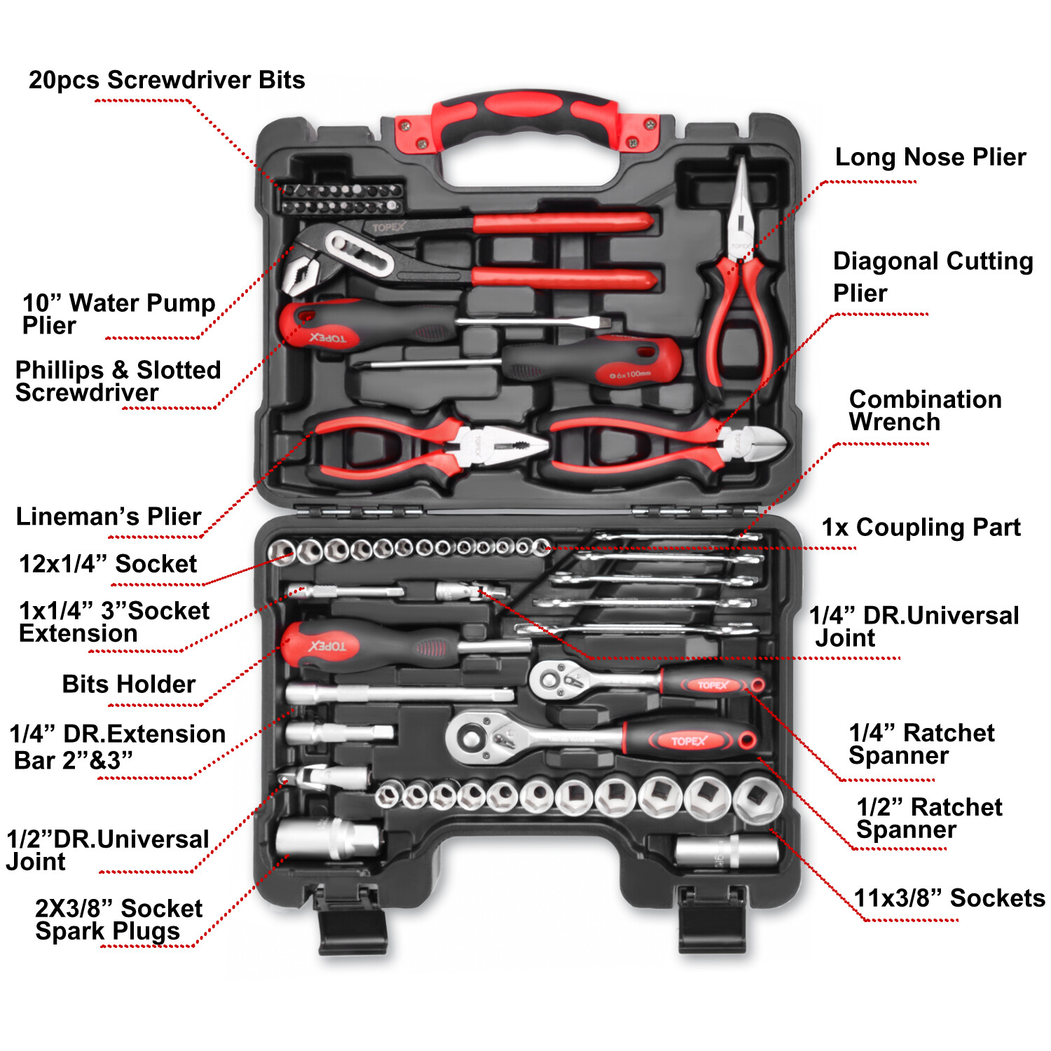 TOPEX 65PCs Hand Tool Set Portable Mechanics Automotive Repair Workshop Tool Kit
