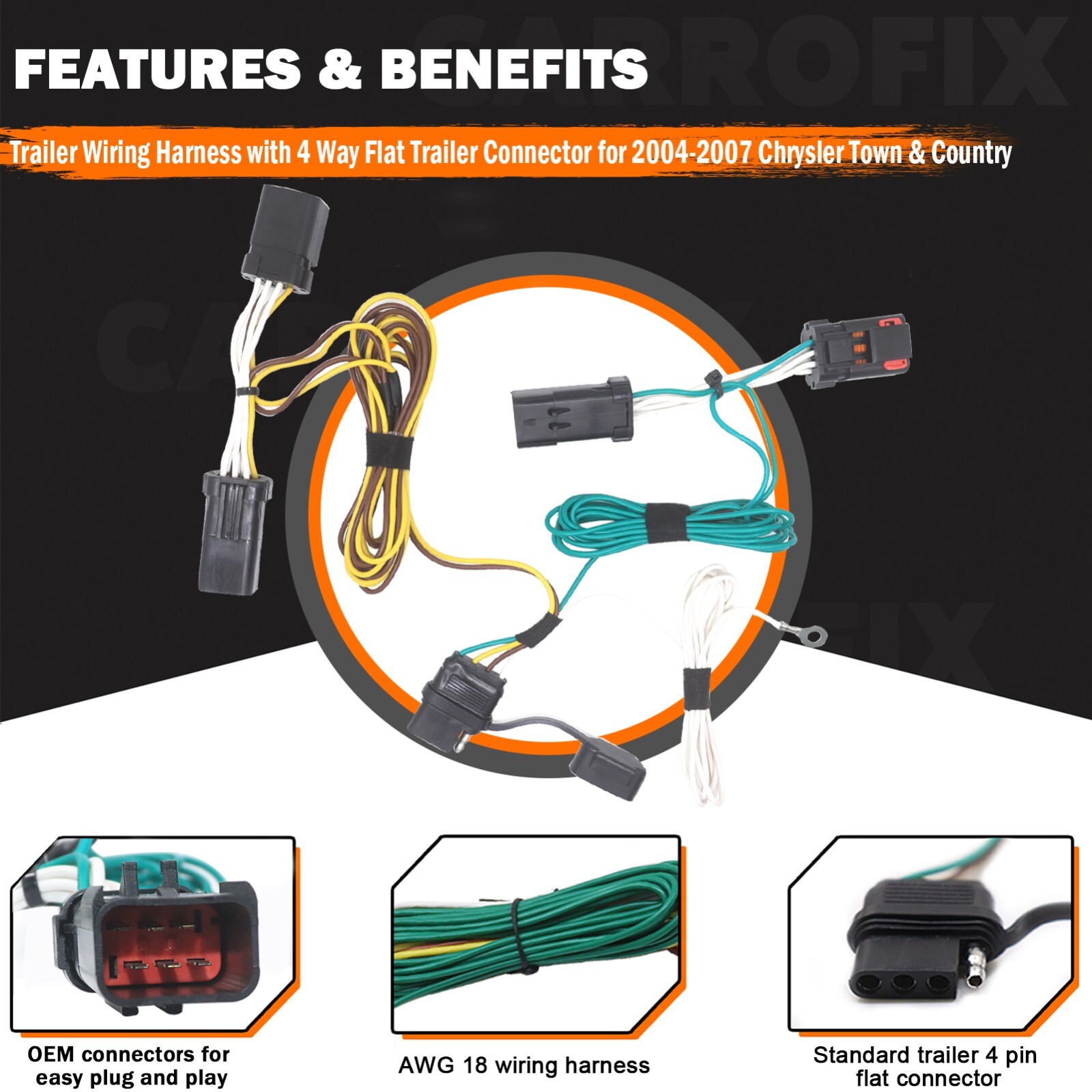 Vehicle Wiring Harness with 4-Way Flat Trailer Connector for 04-07 Dodge Caravan