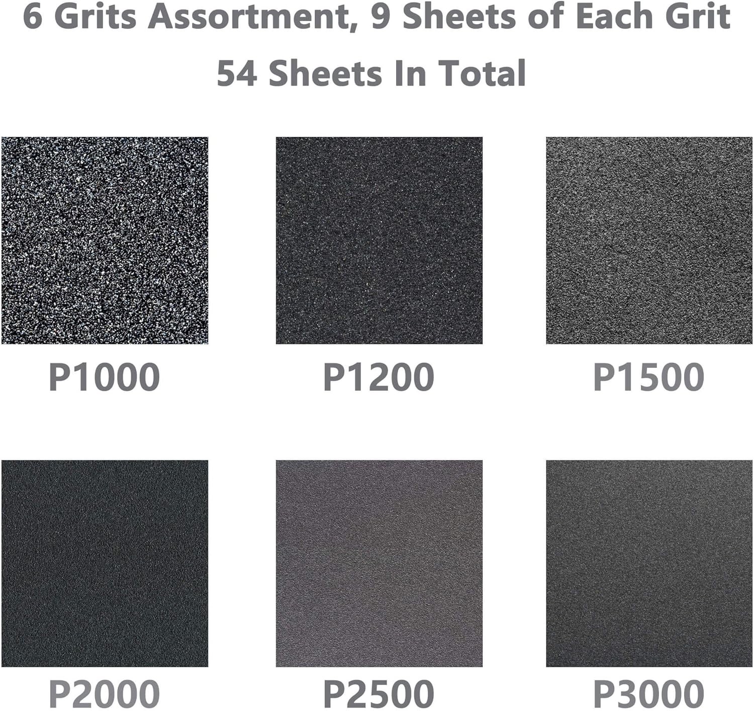 Wet Dry Sandpaper, Assorted 3000/2500/2000/1500/1200/1000 Grit for Automotive W